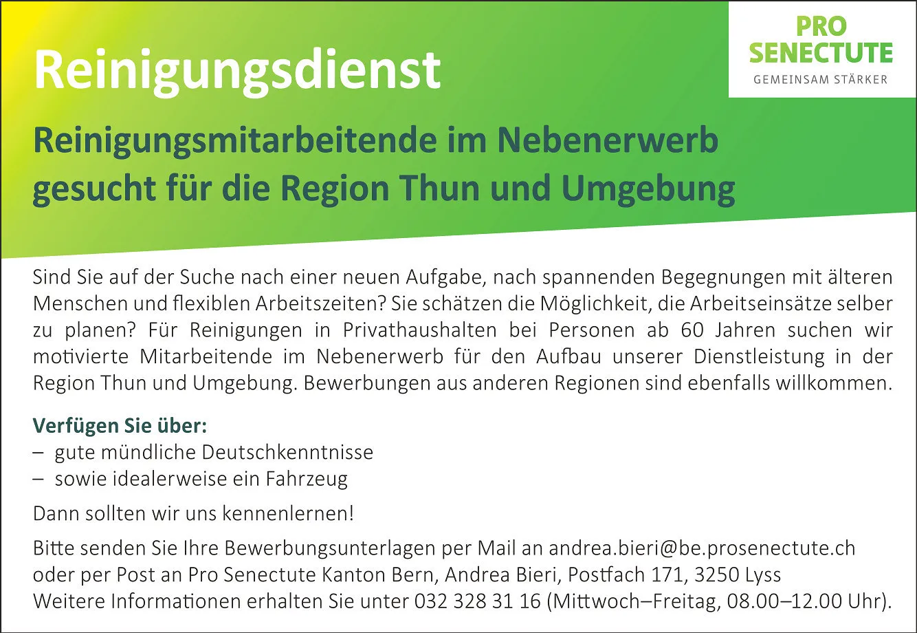 Sind Sie auf der Suche nach einer neuen Aufgabe, nach spannenden Begegnungen mit älteren Menschen und flexiblen Arbeitszeiten? Sie schätzen die Möglichkeit, die Arbeitseinsätze selber zu planen? Für Reinigungen in Privathaushalten bei Personen ab 60 Jahren suchen wir motivierte Mitarbeitende im Nebenerwerb für den Aufbau unserer Dienstleistung in der Region Thun und Umgebung. Bewerbungen aus anderen Regionen sind ebenfalls willkommen.